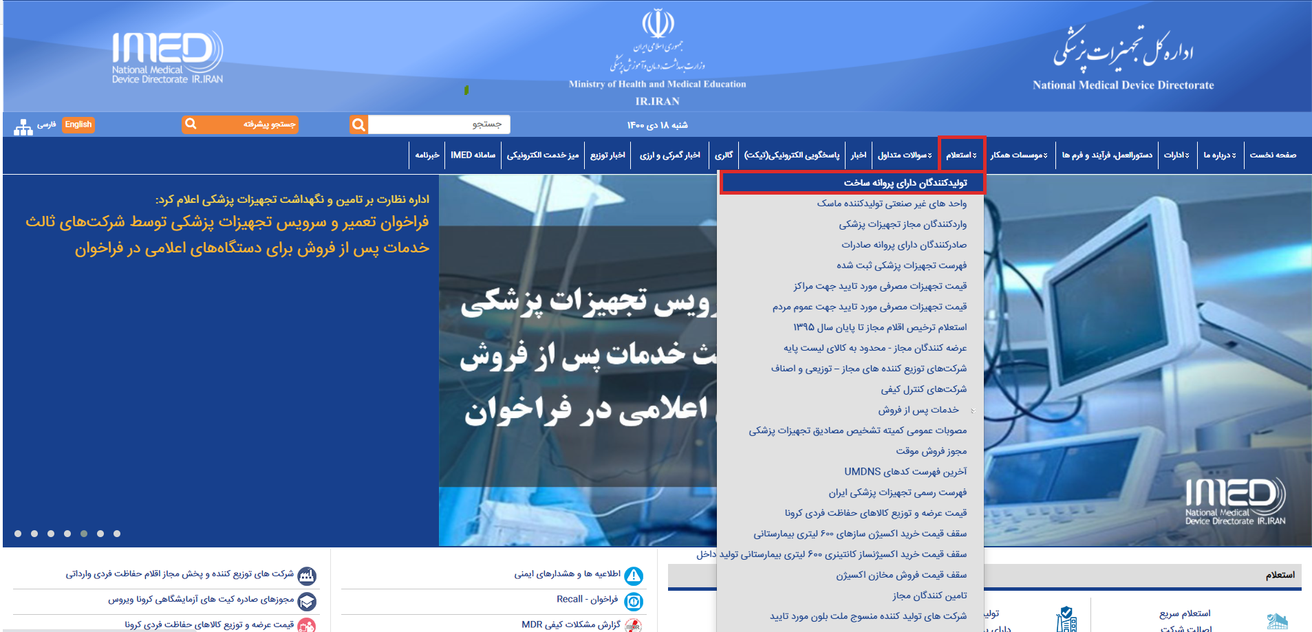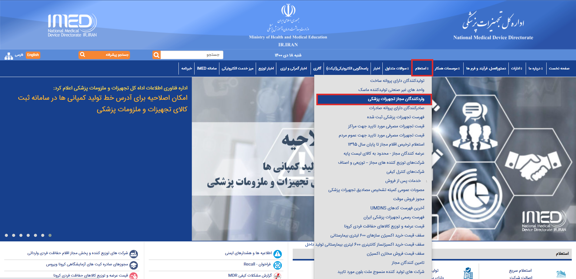 مطابق تصویر فوق بر روی استعلام و سپس واردکنندگان مجاز تجهیزات پزشکی کلیک کنید.