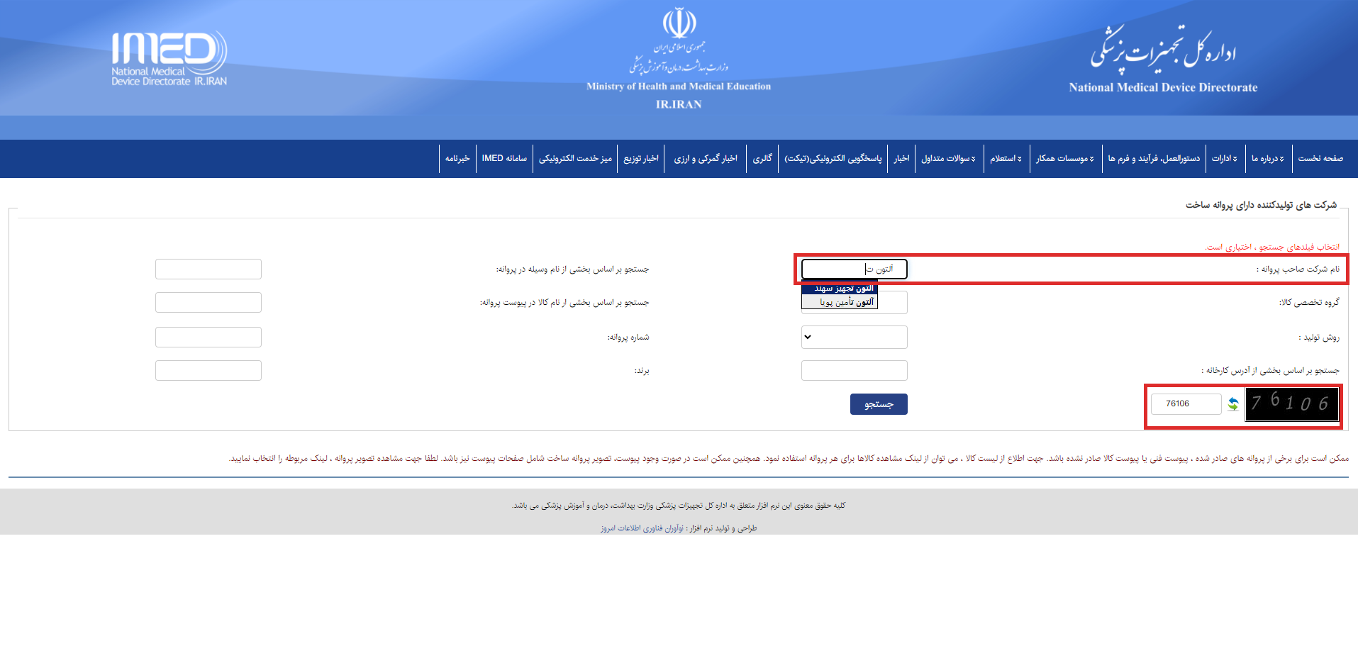 در این مرحله مطابق تصویر، روبروی فیلد نام شرکت صاحب پروانه عبارت “آلتون ت” را تایپ کنید سامانه به صورت اتوماتیک اسم کامل شرکت، “آلتون تامین پویا” را نمایش میدهد، بر روی آن کلیک کنید و سپس کد امنیتی نمایش داده شده را در فیلد مربوطه وارد نمایید.