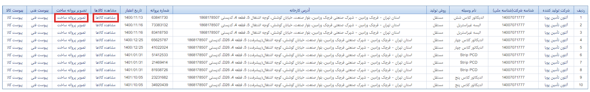 در این مرحله ردیف های دسته بندی محصولات دارای پروانه ساخت شرکت آلتون تامین پویا نمایش داده میشود، امکان مشاهده کالا ها و تصویر پروانه ساخت برای هر ردیف کالایی وجود دارد.